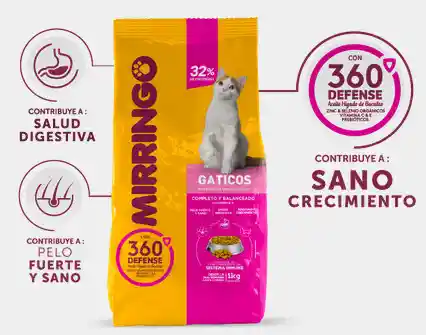Mirringo Gaticos 360 Defense, es un alimento diseñado para satisfacer todos los requerimientos nutricionales para el crecimiento, mantenimiento y lactancia de los gatos. Contribuye al correcto desarrollo de todos sus órganos y sistemas como la visión, el olfato, las defensas y los procesos hormonales.