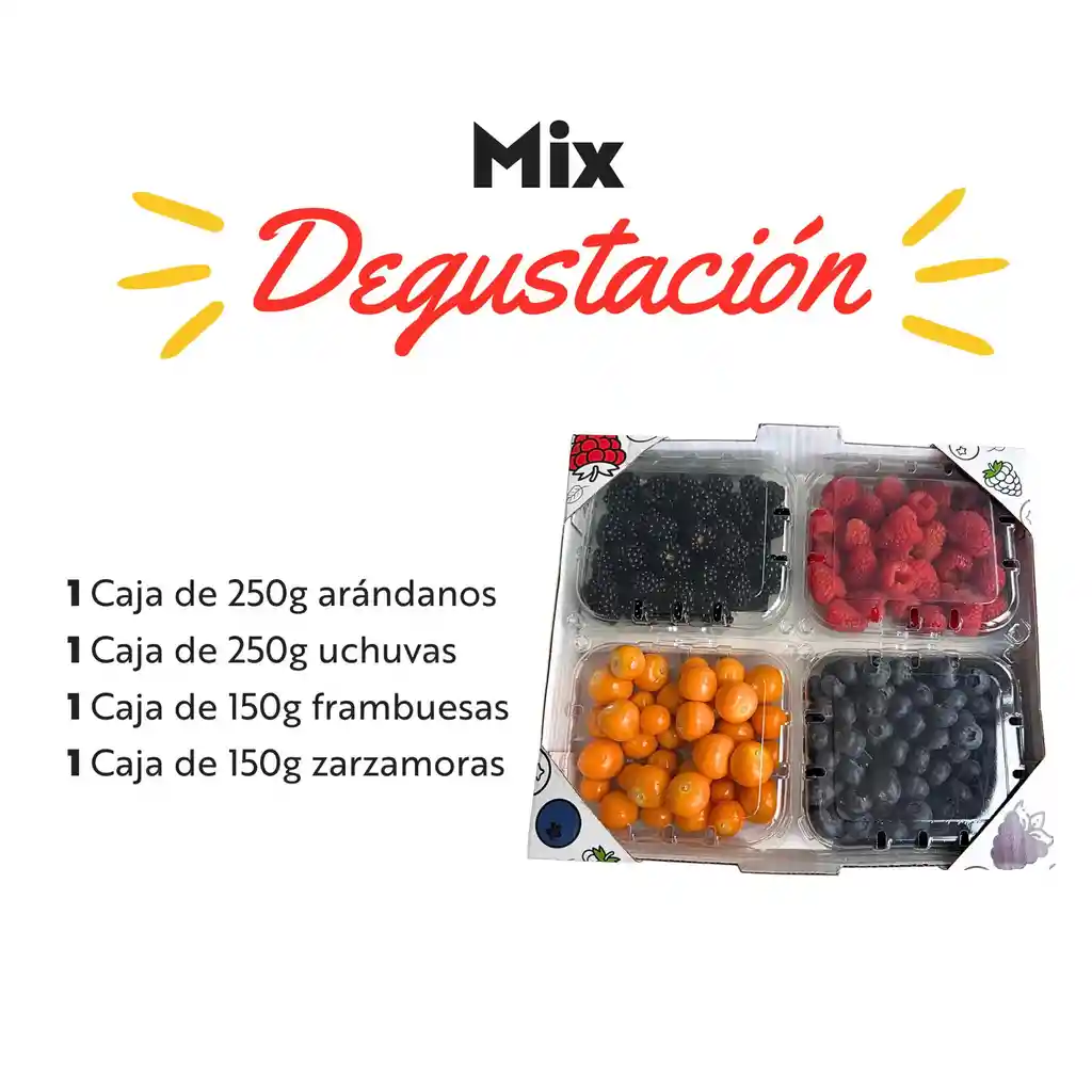 1 caja arándanos 250gr, 1 caja de uchuvas de 250gr, 1 caja de frambuesa de 150gr, 1 zarzamora de 150gr