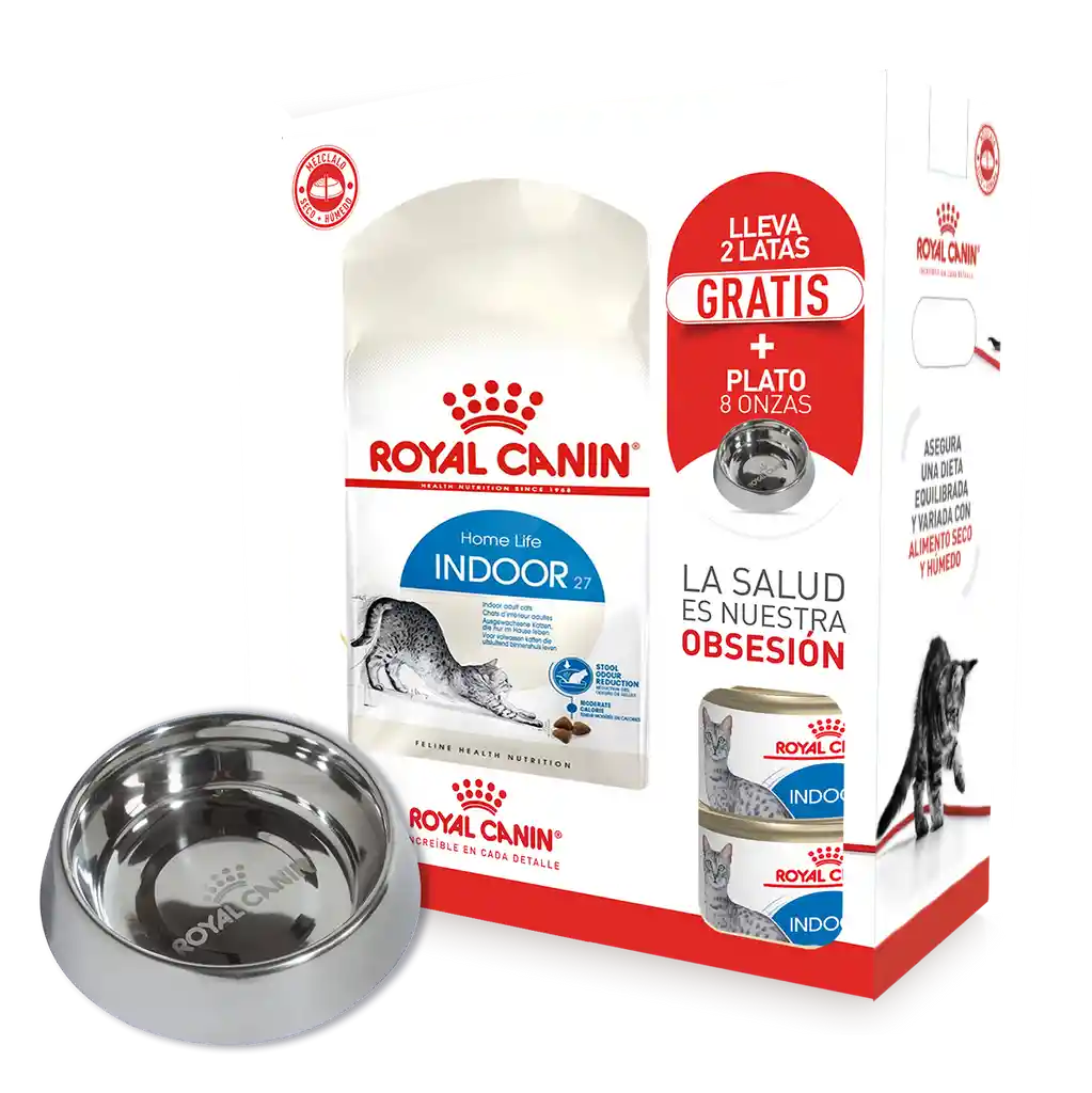 Los gatos adultos que viven dentro de casa, como el tuyo, tienden a hacer menos ejercicio que los gatos con acceso al exterior. Por eso, un alimento equilibrado y completo con un contenido nutricional adaptado es importante para que gocen de una salud óptima. Esta falta de ejercicio puede tener como resultado un tránsito intestinal más lento y heces malolientes. INDOOR 27 de ROYAL CANIN contiene proteínas altamente digestibles (L.I.P.) que ayudan a reducir tanto la cantidad como el olor de las heces. Este alimento aporta un bajo contenido en grasas, para garantizar que el aporte calórico esté adaptado a su nivel de actividad y así contribuir al mantenimiento de un peso saludable. Los gatos de interior dedican gran parte de su tiempo al acicalado. Gracias a su contenido de fibras alimentarias, como el psyllium, este alimento también estimula la eliminación del pelo ingerido disminuyendo la formación de bolas de pelo. En función del estilo de vida, el pelaje y la edad de tu gato tienes otras variedades de Indoor de ROYAL CANIN® en formato de alimento seco: Indoor Appetite Control, e Indoor 7+. Reducción de olores Altamente digestible, Indoor 27 reduce significativamente los olores de las heces ya que disminuye un 60% de media las emanaciones de gases azufrados, causantes del mal olor. Energía moderada Mantenimiento del peso óptimo gracias al aporte calórico moderado, adaptado a su nivel de actividad y por la incorporación de L-carnitina para quemar las reservas de grasa. Reducción de bolas de pelo Favorecida por la asociación de fibras no fermentables y pulpa de remolacha que permiten estimular el tránsito intestinal y facilitar la eliminación del pelo ingerido. Salud urinaria Formulado para ayudar a mantener la salud del sistema urinario de los gatos adultos. Este Kit cuenta con bolsa de 2 kg + 2 latas 85 g y Plato para comida