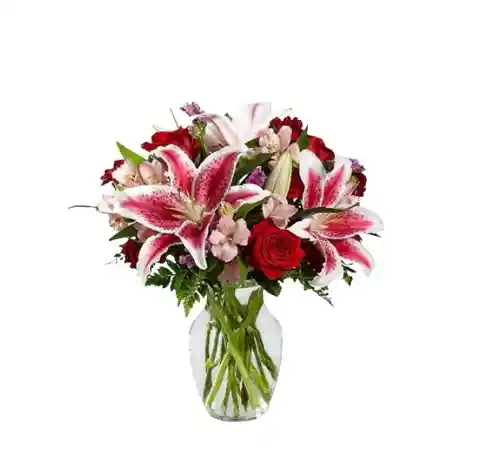 🌸 ¡La mezcla perfecta para sorprender! Arreglo floral "Niña Linda" con rosas rojas y rosadas, lirios aromáticos y mini claveles en jarrón de vidrio. Ideal para: Cumpleaños, aniversarios y sorpresas románticas. Presentación: Listo para exhibir en florero de cristal. Servicio: Entrega inmediata 24/7 en Bogotá.