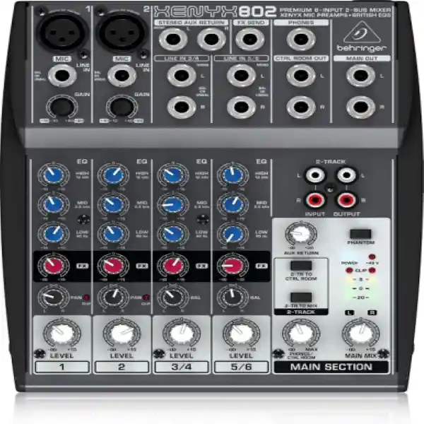 Mixer Behringer 802 Consola Pasiva Mezclador Xenyx BEHRINGER 802 XENYX Presentamos la serie XENYX 802 de mesas de mezclas analógicas de BEHRINGER La serie UB de mesas de mezclas ha forjado conexiones por todo el mundo, y las más de un millón de unidades vendidas hacen de ella una de las series más populares de todos los tiempos. Nuestras nuevas mesas de mezclas XENYX lo llevarán aún más lejos. La XENYX 802 de 8 entradas dispone de un envío de efectos en cada canal, además de entradas de CD/cinta asignables para máxima flexibilidad. Características BEHRINGER 802 XENYX : Mesa de mezclas analógica de ultrabajo ruido con excelente margen de sobrecarga 2 preamplificadores de micrófono XENYX comparables con preamplificadores de gama alta Ecualizadores "británicos" neoclásicos de 3 bandas para un sonido cálido y musical 1 envío postfader para efectos externos en cada canal 1 retorno auxiliar estéreo para efectos o como entrada estéreo independiente Salidas principales, además de salidas de CD/cinta estéreo, auriculares y sala de control Entradas de CD/cinta asignables a la mezcla principal o a las salidas de sala de control/auriculares Componentes de alta calidad y construcción extremadamente robusta para una larga vida