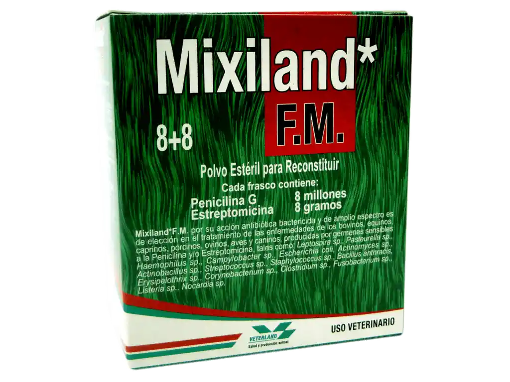 Antibiótico Bactericida de amplio espectro (Penicilina Procaínica, P. Potásica y Estreptomicina) para tratar infecciones agudas y crónicas en animales domésticos. Mixiland® F.M. es una asociación de antibióticos. Útil para combatir una gran gama de microorganismos Gram positivos y Gram negativos por la triple acción y combinación de las Penicilinas: Penicilina G. Potásica de acción inmediata, Penicilina G. Procaínica de acción media y un aminoglicósido como la Estreptomicina.