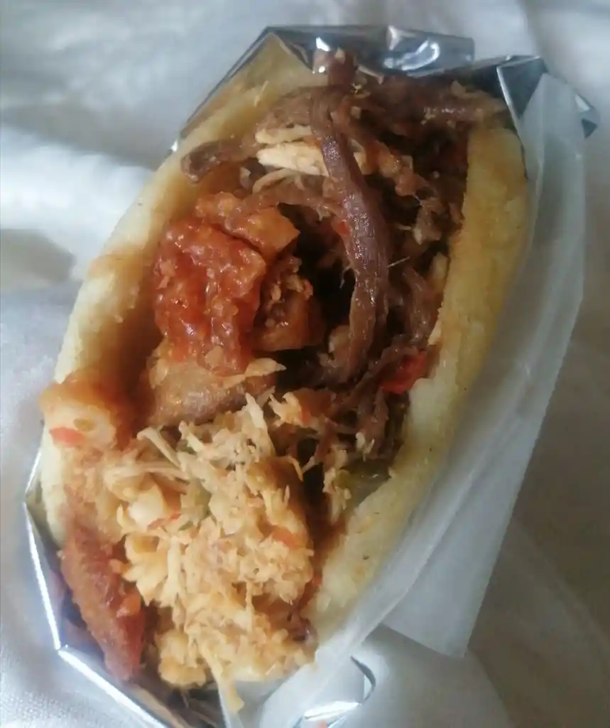 Arepa rellena mixta de 360 grs 60 gr de carne de res 60 gramos de pollo 30 gr de chicharrón crujiente y 210 gr de masa.