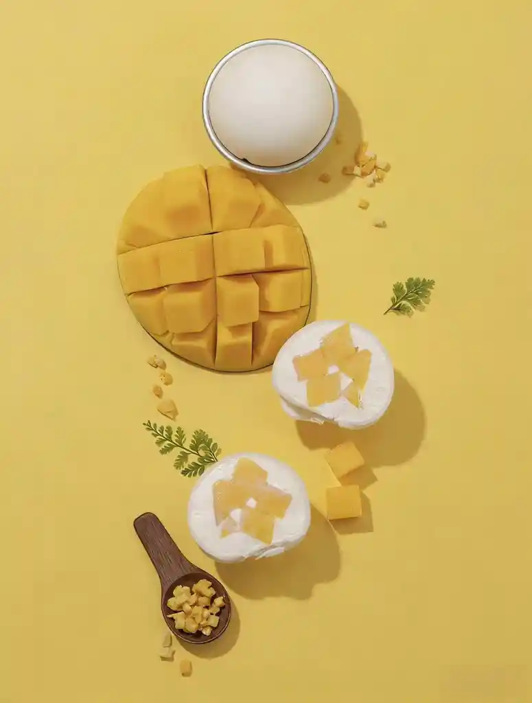 Este es un postre hecho de leche, crema, fruta fresca, fideos de arroz y azúcar. La superficie está decorada con crema, frutas y flores (las personas con alergias alimentarias anteriores no deben comprarlas. Las flores son solo decoraciones y no deben comerse). La fruta de la imagen se ajustará de acuerdo con el agua dulce del día.