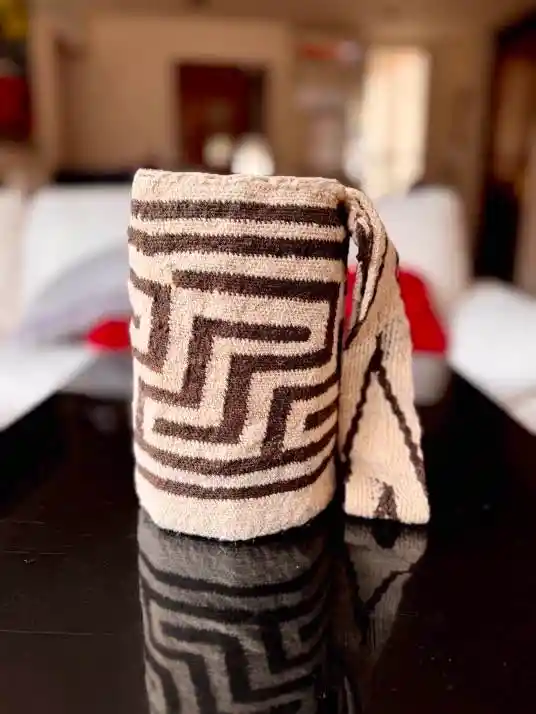 Mochila en lana De Ovejo, elaborada por artesanos Arhuacos de la sierra nevada de santa marta. Alto: 39cm, ancho: 29cm, gaza: 90cm
