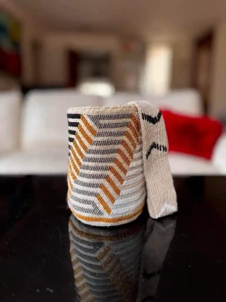 Mochila en lana decorada con mostacilla por artesanos de la sierra nevada de santa marta Alto: 22cm Ancho:20cm Gaza: 95cm