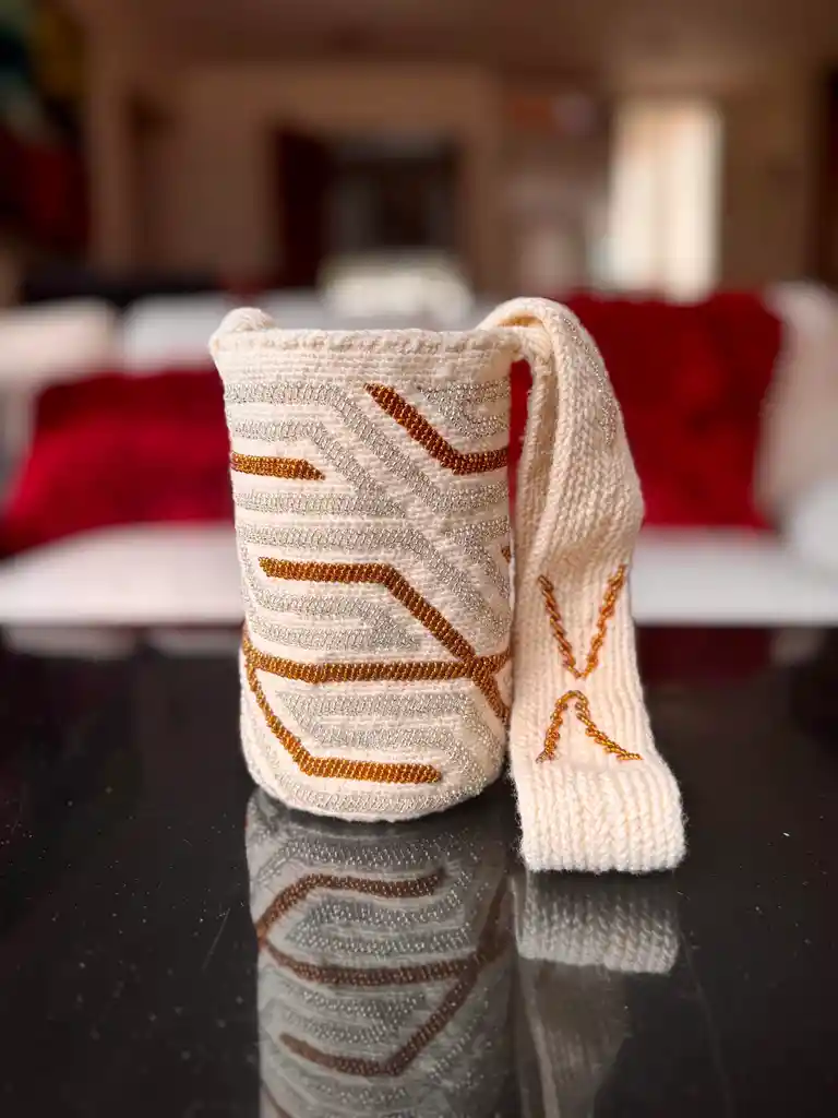 Mochila en lana decorada con mostacilla por artesanos de la sierra nevada de santa marta Alto: 22cm Ancho:20cm Gaza: 95cm