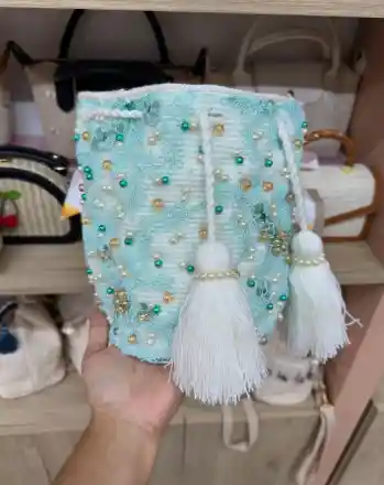 Mochila recamada mediana fabricada a mano para dama en blanco con azul