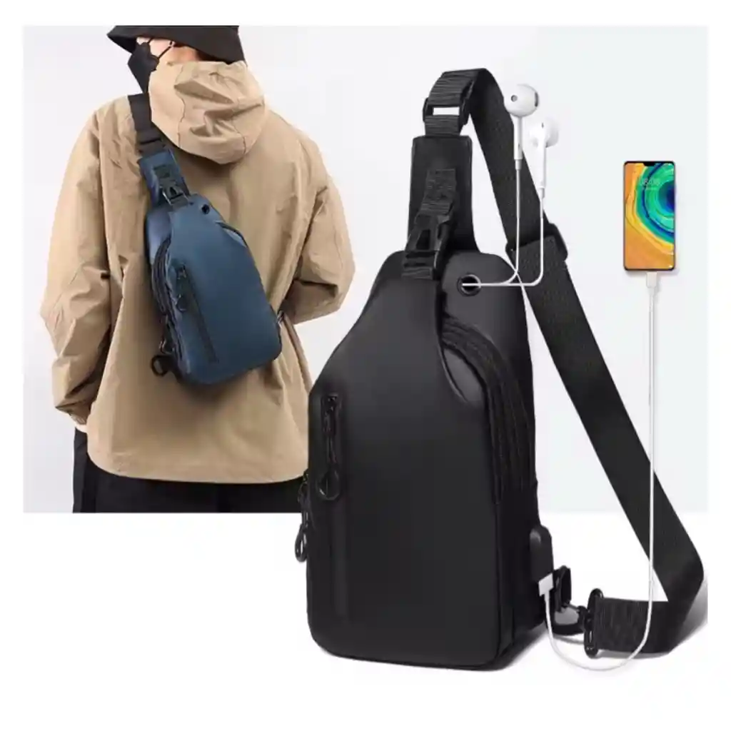 Mochila Pechera Impermeable con Puerto USB Unisex ¡Lleva lo esencial con estilo y comodidad! Esta mochila pechera tipo mensajero es ideal para el día a día, diseñada para quienes buscan practicidad sin dejar de lado la moda. Su diseño moderno y compacto la hace perfecta para viajes cortos, paseos en bicicleta o moto, o simplemente para moverte con libertad sin cargar tanto equipaje. Fabricada en nylon impermeable, protege tus pertenencias de la lluvia y el polvo. Cuenta con 4 compartimientos con cierre, ofreciendo espacio seguro para celular, cartera, llaves, cargador y más. Además, incluye puerto USB externo y salida para audífonos, lo que te permite mantener tus dispositivos cargados y tu música favorita a la mano mientras te desplazas. Características destacadas: Material: Nylon impermeable Correa ajustable para mayor comodidad 4 compartimientos con cierre Puerto USB + cable de carga incluido Salida para audífonos Medidas: 30 cm (alto) x 17 cm (ancho) x 7 cm (profundidad) Nota: El tono del color puede variar ligeramente según la iluminación.