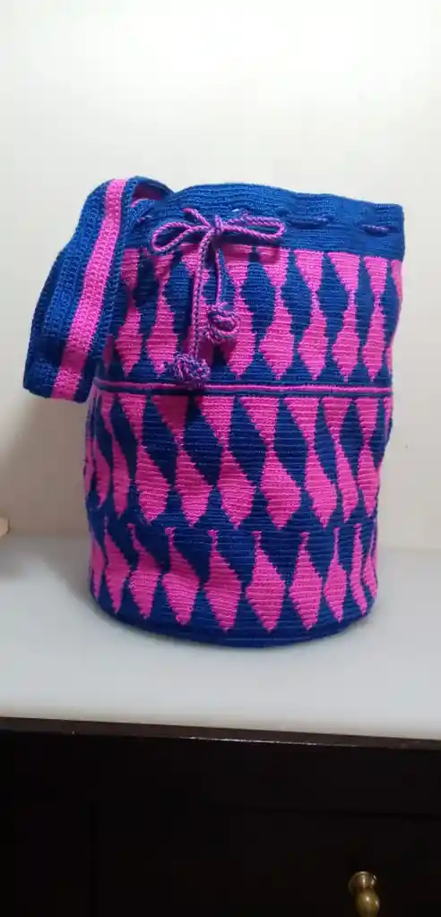 Mochila elaborada a mano en su totalidad en lana macrame color azul y rosa.