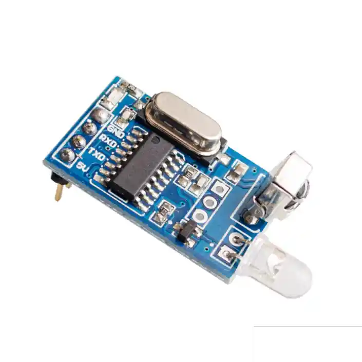 El modulo de decodificacion y codificacion de infrarrojos adopta MCU + cabezal emisor de infrarrojos + cabezal receptor de infrarrojos, que conduce al puerto serie de MCU para conectar otros dispositivos que necesitan control infrarrojo, y puede usarse como comunicacion inalambrica de infrarrojos y transmision de datos. Tiene la funcion de transmision de codigo infrarrojo en formato NEC, que puede controlar el 99% del equipo con formato infrarrojo NEC, como la mayoria de los televisores, decodificadores, DVD, ventiladores electricos y otros equipos electricos. Solo necesita usar el conocimiento de comunicacion en serie del microordenador de un solo chip para enviar el comando especificado a traves del puerto en serie para transmitir el modulo de control; La operacion de decodificacion infrarroja se realiza a traves del modo de recepcion del puerto serie para obtener la informacion de codificacion del control remoto. Tambien puede usar el USB a TTL de la tienda combinado con la computadora para controlar otros dispositivos. Despues de conectar el circuito, el software de la computadora host de la computadora puede simplemente enviar y recibir comandos para realizar la funcion de codec. Dos modulos pueden completar la operacion de transceptor. Parametro: Tamaño: 2.7x1.7x1.3cm Tension de alimentacion: DC 5 V Corriente de suministro:> 100mA Consumo de energia en espera: aproximadamente 17.5mA Metodo de comunicacion: comunicacion en serie (nivel 5V TTL) Distancia de emision: 6-10 metros (diferente dependiendo de la luz ambiental y la condicion del transceptor) Distancia de recepcion: 6-10 metros (relacionado con la potencia del equipo de transmision) Admite chip de codificacion NEC: (Chip de codificacion tipico como uPD6121, uPD6122, TC9012 y muchos modelos de chips compatibles, como PT2221, PT2222, SC6121, SC6122, SC9012, etc.) Señal infrarroja: longitud de onda 940nm 38KHz La velocidad en baudios predeterminada es 9600 bps, y el puerto serie se puede configurar en 4800, 19200, 57600 bps. LA COMPRA INCLUYE: 1X MODULO EMISOR RECEPTOR DECODIFICADOR