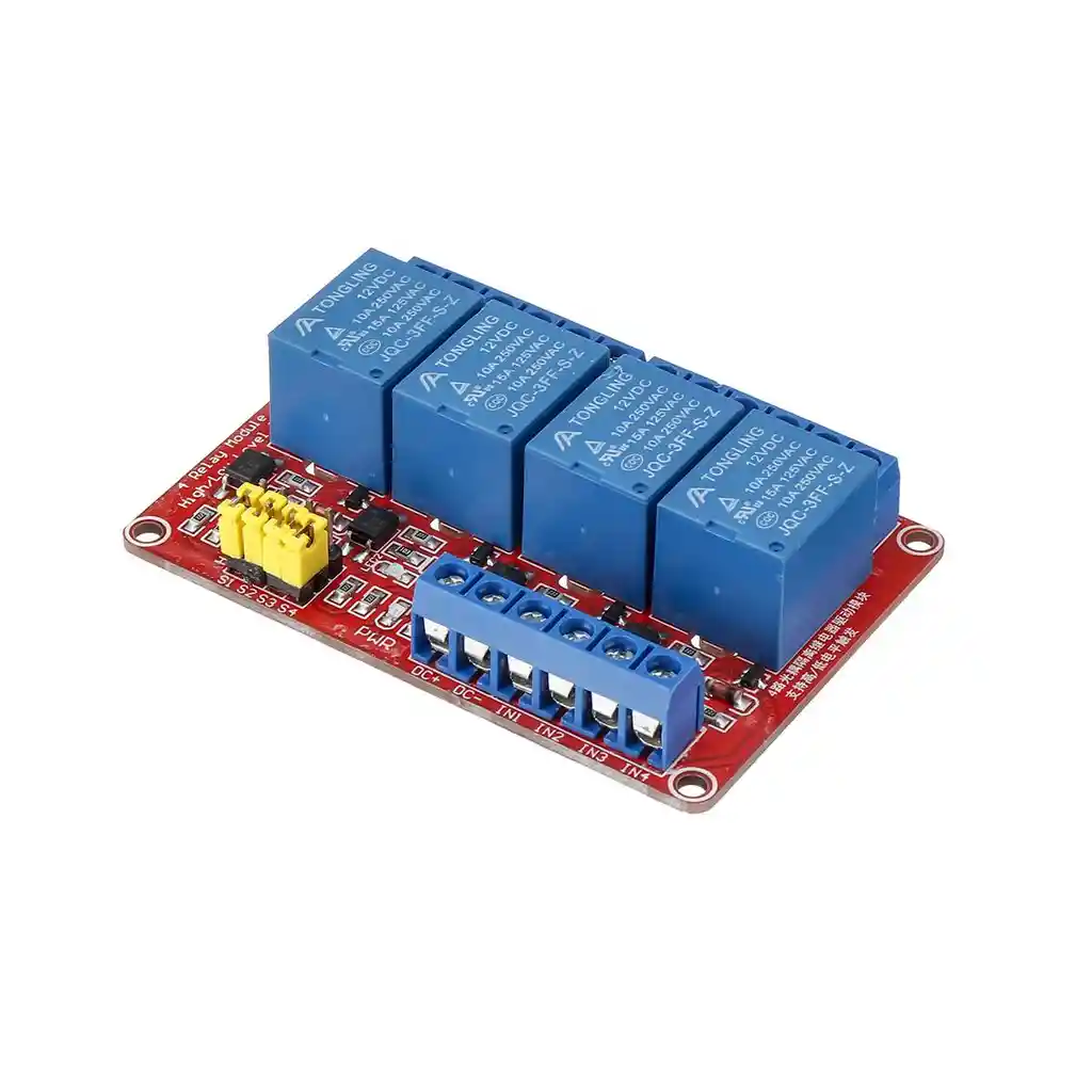 Material: cobre + plastico Color: rojo y azul Tipo de canal: 4 Voltaje: 12V Interfaz del modulo: 1. DC +: fuente de alimentacion positiva (VCC) 2. DC-: fuente de alimentacion negativa (GND) 3. IN: puede ser un rele de control de nivel alto o bajo Salidas de rele: 1. NO: interfaz de rele normalmente abierta 2. COM: reles de interfaz comunes 3. NC: interfaz de rele normalmente cerrada Opciones de activacion de nivel alto y bajo: Es un disparador de bajo nivel cuando el puente se conecta al pin BAJO Es un disparador de alto nivel cuando el puente se conecta al pin ALTO caracteristicas: 1. El modulo utiliza un rele de calidad genuina, interfaces normalmente abiertas Carga maxima: AC 250V / 10A, DC 30V / 10A. 2. Uso del aislamiento del optoacoplador SMD, capacidad de conduccion, rendimiento estable; disparar corriente 5mA. 3. El modulo Tension de funcionamiento 12V. 4. El modulo puede ser alto o bajo mediante un gatillo de ajuste de puente. 5. Diseño tolerante a fallas, incluso si la linea de control esta rota, el rele no funcionara. 6. El indicador de encendido (verde), el indicador de estado del rele (rojo). 7. El diseño de la interfaz de la naturaleza humana, todas las interfaces estan disponibles a traves de terminales de conexion directa, muy conveniente. 8. Cuatro agujeros para pernos de montaje, diametro 3.1 mm. LA COMPRA INCLUYE: 1 x MODULO RELE 12V 4 CANAL LOW/HIGH LEVEL TRIGGER