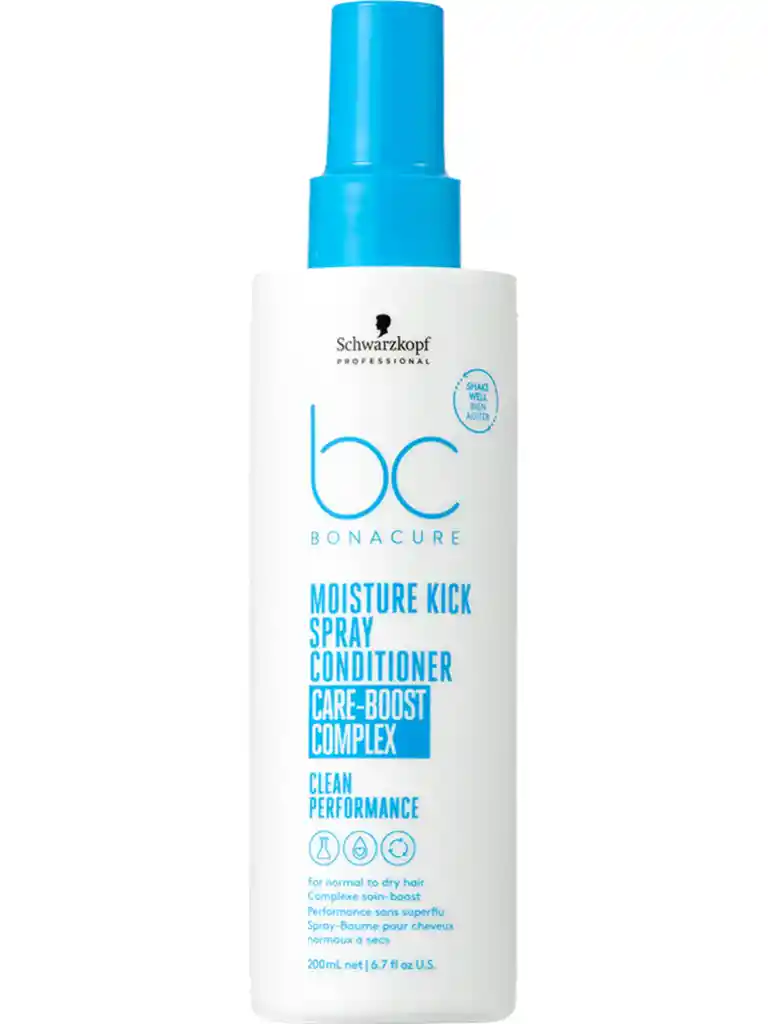 Spray acondicionador sin aclarado de Bonacure Moisture Kick, especialmente formulado con el Complejo Care Boost para acondicionar e hidratar al instante el cabello de normal a seco, texturizado, quebradizo o rizado. Su fórmula ayuda al cabello a retener su nivel óptimo de hidratación para una sensación de ligereza que dura hasta 48 horas. Usar como spray desenredante para conseguir un cabello de aspecto sano y suave y con una elasticidad y manejabilidad mejoradas.