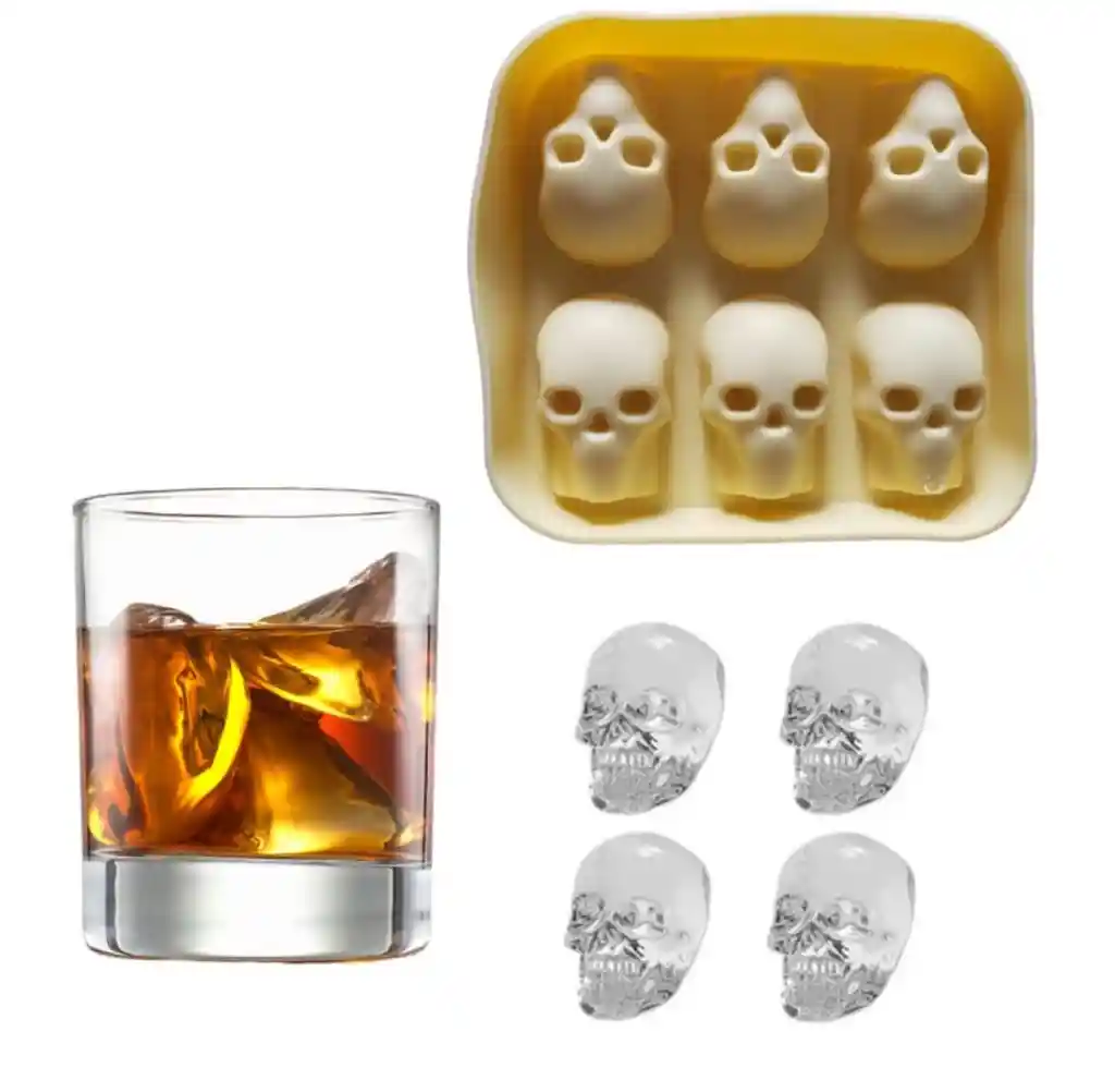 Un innovador molde de silicona con forma de calavera, fácil de usar en toda ocasión, para elaboración de chocolates, coctelería y bebidas. Sorprende a tus amigos o en tu negocio con este curioso molde. Especificaciones: Tamaño de molde 12x10x2 (6 cubos). Tamaño por calavera 4.2 cm aprox. Resistente temperaturas -30 °C a 200 °C.