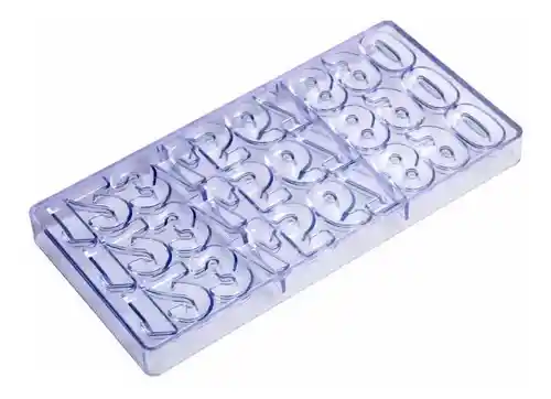 MOLDE DE ACRILICO RECTANGULAR FORMA NUMEROS DEL 0 AL 9 CON 30 CAVIDADES PARA HACER CHOCOLATE O GOMITAS. MEDIDAS: -13.5 CM DE ANCHO -27.3 CM DE LARGO -4X2.3X1 CM MEDIDA DE CADA CAVIDAD