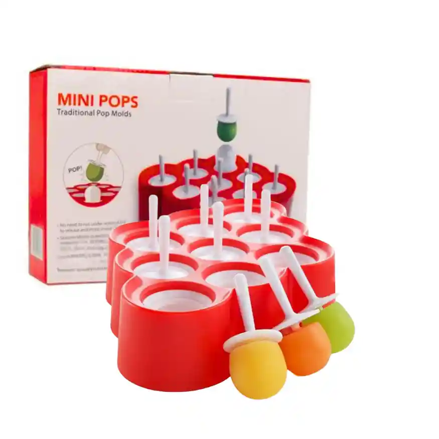 Este molde tiene la base plástica con un largo de 25 cm x 17,5 de ancho, lo que lo hace ideal para cualquier refrigerador. Cuenta con 9 cavidades de silicona, en forma de semicírculo de 3 cm de diámetro. Adicional al molde, también recibirá 9 palos plásticos con base anti-goteo.
