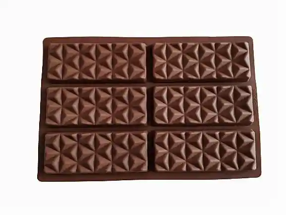 Molde silicona flexible. Figura barra de chocolate diamante x 6 cavidades. Fabricado en silicona grado alimenticio. Es un molde flexible, suave, antiadherente y de fácil lavado. Resistente bajas y altas temperaturas entre -40 y 230 grados centígrados. Ideal para trabajo con chocolate, fondant y más. Medidas del molde: 26 x 17 Cms. Cavidad 12 x 5 Cms 1.5 Cms de profundidad.