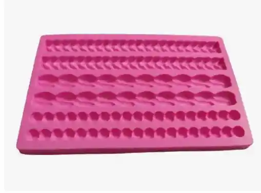 Molde en silicona con formas de perlas y cadenas. Ideales para trabajo en fondant. Bordes ideales para tus tortas y productos de pastelería y repostería. Medidas del molde 19x12.2 Cms. Ancho de las perlas 1 cm. Cadenas de 1.5 Cms de ancho.
