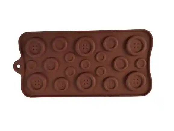 Molde silicona flexible. Referencia botones. Ideal para chocolateria, fondant. Medida del molde 21 x 10.5 Cms. Medida botón grande 3.2 Cms de diámetro. Medida botón mediano 2.3 Cms de diámetro. Medida botón pequeño 1.1 Cms de diámetro.