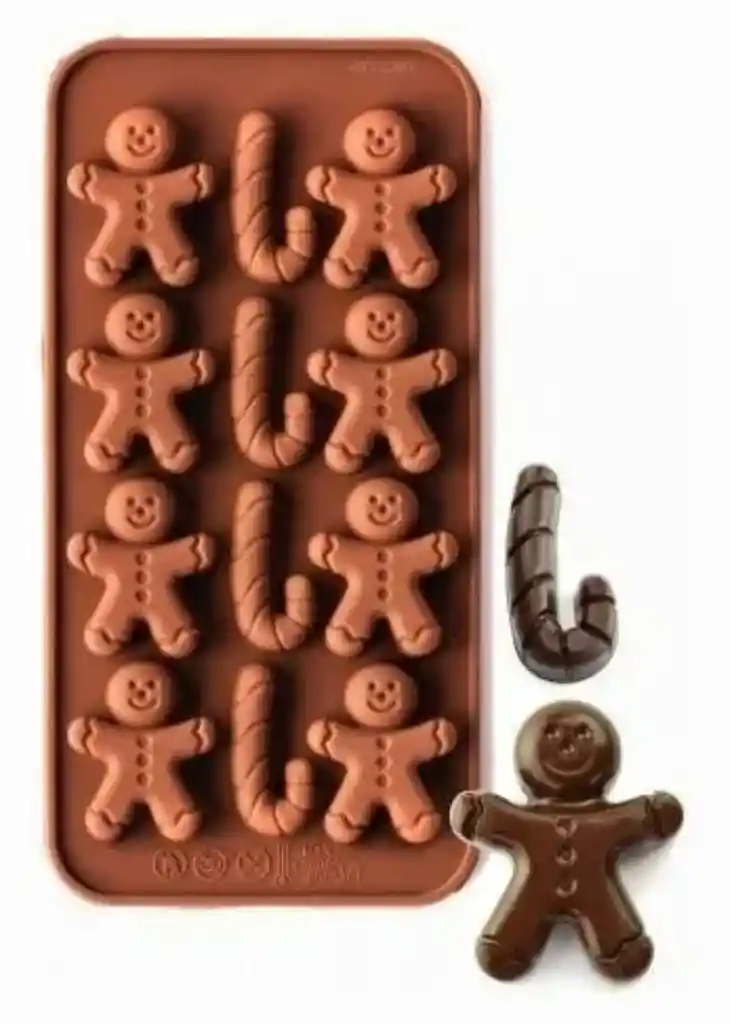 Molde elaborado en silicona horneable. Figuras muñeco de gengibre y bastón. Ideal para figuras en chocolate. Medida del molde 20 x 10 Cms. Figura 4.5 x 3.5 Cms.