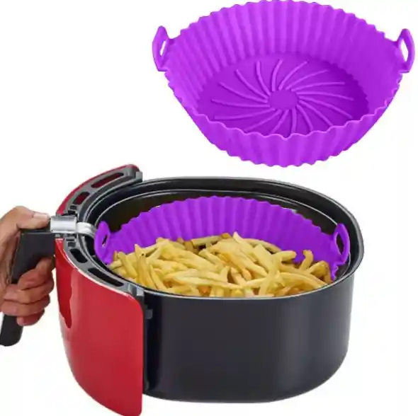 Molde Silicona Olla Freidora Air Fryer Reutilizable Morado Material: Silicona Color: Morado Tamaño: - Diámetro Inferior: 16 cm - Diámetro Superior: 20 cm - Alto: 6 cm Resistencia a la temperatura: - 40 grados Celsius a 240 grados Celsius Características: reutilizable, antiadherente, resistente a altas temperaturas, fácil de lavar El paquete incluye: 1 Olla de silicona para freidora de aire.