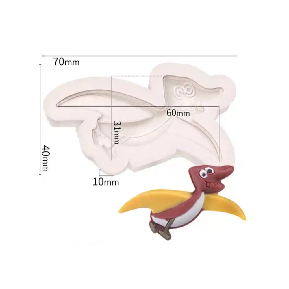 Molde en silicona en forma de dinosario pterodactilo, ideal para la decoración de fiestas infantiles dándole un toque original a tus tortas, cupcakes, galletas, postres y más. Podemos usarlo con diferentes tipos de masas o pastas moldeables como fondant , mazapán, pasta de goma, chocolates, el molde ideal para la decoración de fiestas infantiles. Fabricado en silicona de grado alimenticio resistente al calor y tiene una amplia tolerancia a la temperatura desde -0° C hasta 230° C, seguros para su uso en lavavajillas, horno, congelador, nevera y microondas. Tamaño cavidades: 7 x 3.5 x 0.6 cm