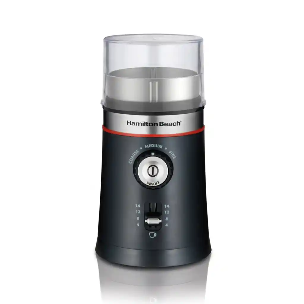 Molino de Café y Especias Hamilton Beach® – Precisión y Sabor en Cada Taza Disfruta de café recién molido con el aroma y sabor más intenso gracias a este molino de café y especias con 5 configuraciones de molido, desde grueso hasta extra fino, ideal para espresso. Su función manos libres permite moler con solo un toque y se apaga automáticamente al terminar. Además, puedes ajustar la cantidad exacta de café para 4 hasta 14 tazas, evitando desperdicios. La cámara de acero inoxidable desmontable facilita un vertido sin derrames y una limpieza rápida, ya que es apta para lavavajillas. También cuenta con un compartimiento oculto para el cable, manteniendo tu cocina ordenada. Potente, práctico y versátil, perfecto para café y especias. ¡Molido fresco en segundos!