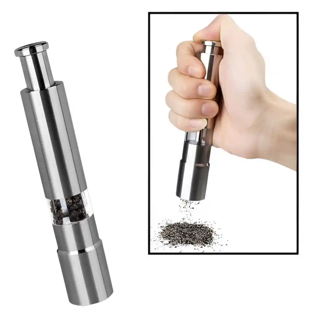 Utensilio de cocina manual mini fabricado en acero inoxidable de alta calidad, diseñado para moler y dispensar pimienta, sal gruesa y otras especias de manera práctica y precisa. Su diseño elegante en color plateado aporta un estilo moderno y profesional a la mesa o cocina, combinando durabilidad y funcionalidad en un solo accesorio. El mecanismo de molienda está elaborado en cerámica resistente al desgaste, lo que garantiza un triturado uniforme y ajustable según la necesidad, desde granos finos hasta gruesos. Compacto, portátil y fácil de usar con una sola mano, es ideal para uso doméstico y profesional. Especificaciones técnicas Material: acero inoxidable de alta calidad con resistencia a la corrosión Mecanismo: molienda de cerámica ajustable (fino a grueso) Uso: manual, fácil de accionar con una sola mano Color: plateado Medidas: 15.36 cm de largo, 2.75 cm de diámetro Diseño: ergonómico, compacto y portátil Mantenimiento: fácil de desmontar y limpiar, resistente a la humedad y al óxido Aplicaciones: apto para pimienta negra, pimienta blanca, sal marina, sal rosada, semillas de mostaza, comino, cilantro, entre otras especias secas.