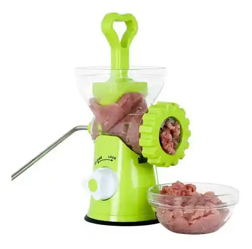Práctico molino manual procesador de carnes y pollo. Material en acero, incluye 2 discos de corte de carne y una boquilla para embutidos.