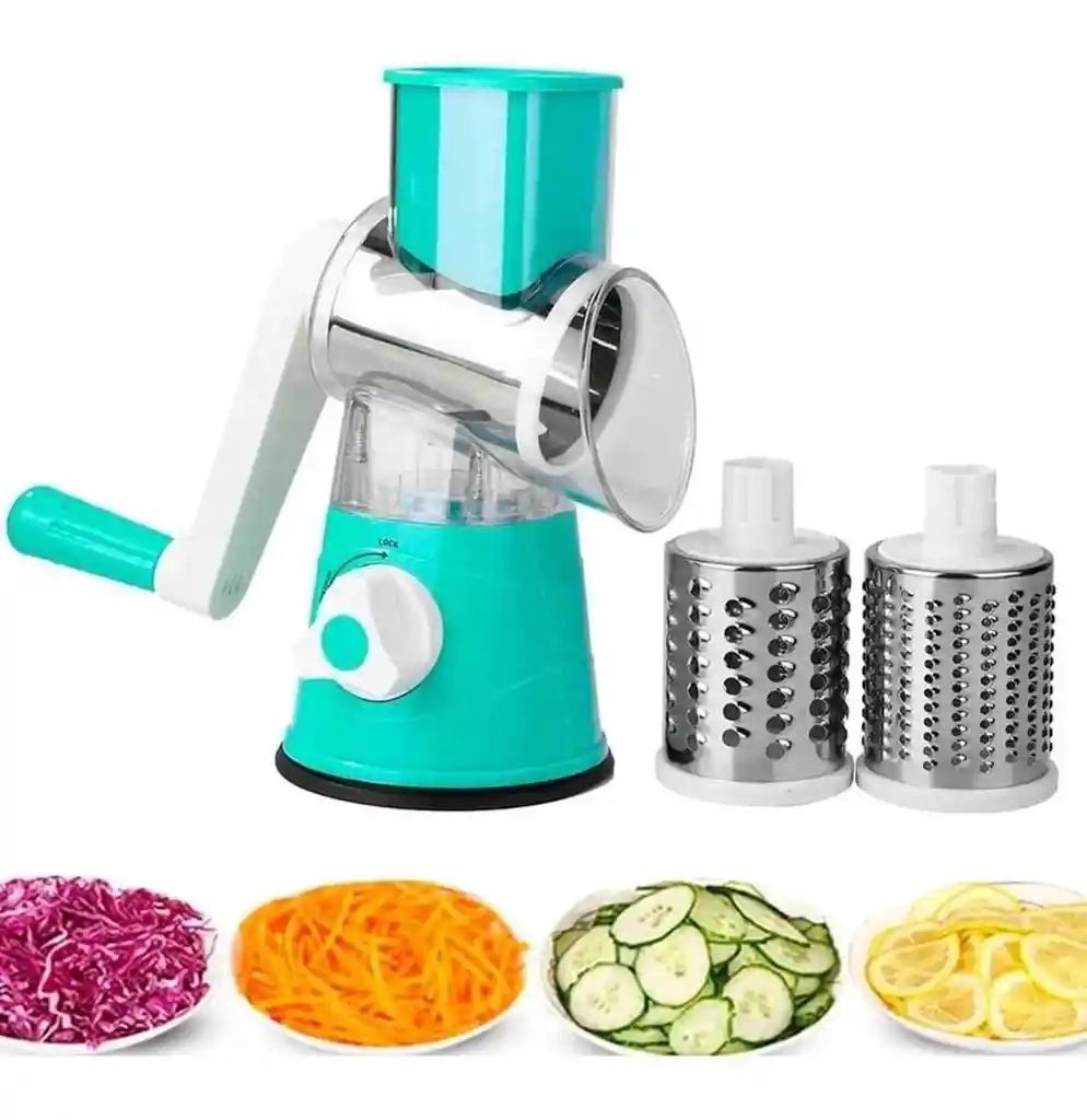 El molino mandolina giratorio para rallar queso, verduras o frutas es multifuncional, permitiendo rebanar, picar y rallar con poco esfuerzo. Solo se debe elegir la cuchilla, ya sea la fina, la gruesa o la de rebanar. Estas cuchillas en acero inoxidable son excelentes para queso, vegetales, galletas, nueces y más. Fácil de limpiar, lavable en lavavajillas. El rallador mandolina es ideal para rebanar verduras, rallar repollo o queso, picar cebolla sin lágrimas o rallar finamente queso o chocolate para tus platillos favoritos. Incluye: 1 molino mandolina 1 cuchilla de tambor corte grueso 1 cuchilla de tambor para rebanar 1 cuchilla de tambor fina para trituración