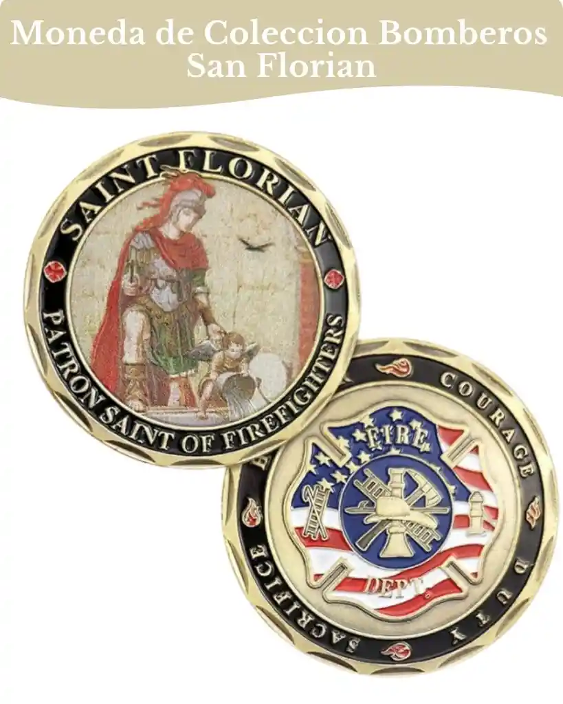 Esta imagen muestra una moneda de desafío (challenge coin) de colección, dedicada a los bomberos y bajo la protección de San Florián. Es un objeto conmemorativo con un alto nivel de detalle y simbolismo religioso y profesional. Aquí tienes la descripción de ambas caras: Anverso (Cara Principal) Imagen Central: Aparece una representación de San Florián, el santo patrón de los bomberos. Se le muestra con vestimenta de soldado romano, vertiendo agua desde un cubo para apagar un incendio, una imagen clásica de su iconografía. Inscripción: En el borde circular negro se lee en inglés: "SAINT FLORIAN - PATRON SAINT OF FIREFIGHTERS" (San Florián - Santo Patrón de los Bomberos). Detalles: Bordes dorados con relieve y pequeñas cruces rojas decorativas a los lados. Reverso (Cara Posterior) Símbolo Central: Presenta la Cruz de Malta (o Cruz de San Florián), que es el símbolo internacional de los bomberos. Dentro de la cruz se encuentran herramientas tradicionales: una escalera, un hacha, un hidrante y un casco de bombero sobre una boquilla de manguera. Fondo: El escudo tiene de fondo la bandera de los Estados Unidos (barras y estrellas). Valores del Bombero: En el borde negro se resaltan tres palabras fundamentales que definen la profesión: COURAGE (Valor) DUTY (Deber) SACRIFICE (Sacrificio) Decoración: Pequeñas llamas separan cada palabra en el borde. Características Generales Material: Generalmente están fabricadas en una aleación de metal con acabado en baño de oro y detalles en esmalte de color. Uso: Es un objeto ideal para coleccionistas, como amuleto de protección para bomberos en activo, o como regalo honorífico en ceremonias de graduación o jubilación dentro del cuerpo de bomberos. Estilo: Robusto y con relieve táctil (3D), típico de las monedas militares y de servicios de emergencia.