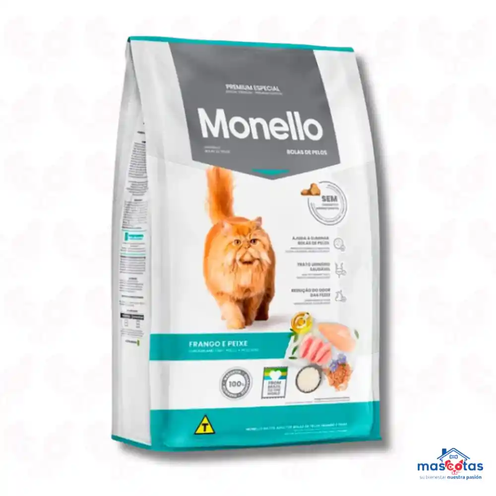 El alimento Monello Gato Bola de Pelo es un concentrado para gatos adultos con problemas de bolas de pelo, que usa celulosa y pulpa de remolacha para ayudar a eliminarlas del tracto digestivo, reduciendo vómitos y obstrucciones, e incluye ingredientes como salmón y omegas 3 y 6 para la salud de piel y pelaje, además de ser libre de colorantes y saborizantes artificiales y favorecer la salud urinaria. Características Principales: Control de Bolas de Pelo: Su fórmula con celulosa facilita el tránsito de los pelos ingeridos a través del intestino, evitando que se formen bolas o causen problemas. Salud Digestiva: La pulpa de remolacha (fibra) mejora la digestión, la absorción de nutrientes y disminuye el olor y volumen de las heces. Ingredientes de Calidad: Contiene harina y aceite de salmón, ricos en Omega 3 y 6, para un desarrollo equilibrado y un pelaje brillante. Bienestar Urinario: Promueve un tracto urinario sano para prevenir cálculos. Sin Aditivos Artificiales: No contiene colorantes ni aromatizantes artificiales, ofreciendo una opción más natural. Fórmula Completa: Aporta vitaminas, minerales y taurina para una nutrición completa. Beneficios para tu Gato: Menos vómitos por bolas de pelo. Sistema digestivo más saludable. Mayor bienestar general. Pelaje y piel más sanos
