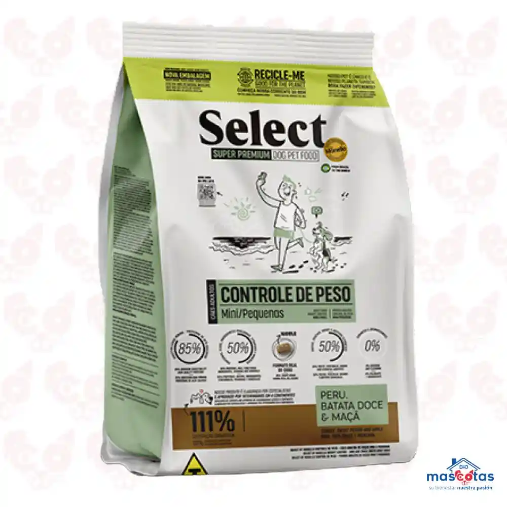 Select by Monello Control de peso Mini/pequeñas Composición básica del producto Ingredientes seleccionados fuentes de proteínas, aceites, ingredientes funcionales, vitaminas y minerales, mín. 50% (harina de vísceras de aves – mín. 23%, harina de salmón – mín. 0,5%, harina de carne y huesos de pavo – mín. 0,5%, aceite de aves, aceite de salmón – mín. 0,5%, hidrolizado de hígado de aves, mezcla de huevos deshidratados, salvado de gluten de maíz, salvado de soya, biomasa de microalgas Schizochytrium sp. – mín. 0,1%, L-carnitina, levadura de cerveza inactiva deshidratada, mezcla prebiótica – mín. 0,1% – compuesto de: pared celular de levadura, galacto-oligosacáridos, fructo-oligosacáridos y levadura de caña de azúcar seca, hexametafosfato de sodio, sulfato de condroitina, sulfato de glucosamina, extracto de Yucca, lisina, vitaminas A, D3, E, C, K3, B1, B2, B6, B12, pantotenato de calcio, ácido fólico, ácido nicotínico, biotina, cloruro de colina, minerales cloruro de sodio, cloruro de potasio, sulfato de manganeso, sulfato de zinc, glicinato de zinc, sulfato de hierro, sulfato de cobre, yodato de calcio, selenito de sodio, selenio metionina). Frutas, vegetales, granos y aditivos esenciales, mín. 50% (grano de maíz, salvado de trigo, arroz quebrado, mezcla concentrada de frutas y vegetales deshidratados – compuesta por: harina de papa dulce – mín. 0,35%, manzanas – mín. 0,03%, plátanos, arándanos – mín. 0,01%, zanahorias – mín. 0,03% y harina de arvejas – mín. 0,05%, pulpa de remolacha deshidratada – mín. 0,5% y aditivos antioxidantes BHA y BHT).