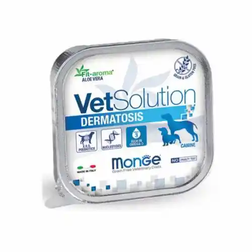 Mongue vet Solution Dermatosis Es un alimento dietético completo para perros formulado para apoyar la función dérmica en caso de dermatosis y pérdida excesiva del pelo. Contiene nucleótidos para apoyar el sistema inmunológico, aloe vera para el soporte de la piel, xiloligosacáridos (XOS) para preservar la microbiota intestinal y la formulación se caracteriza por una alta concentración de ácidos grasos esenciales.