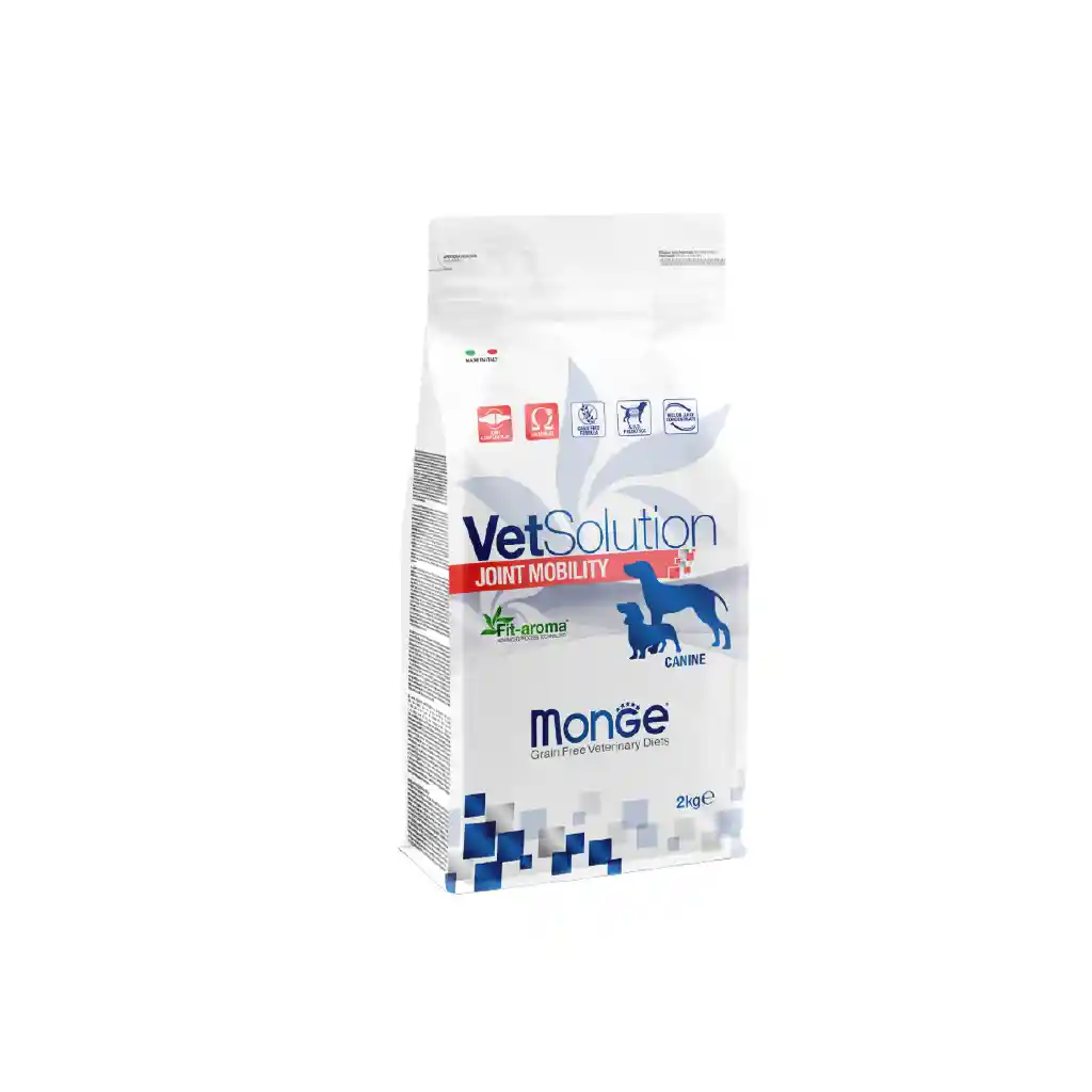 Monge VETSOLUTION JOINT MOBILITY CANINE es un alimento dietético completo para perros formulado para apoyar el metabolismo articular en caso de artrosis. Contiene un concentrado de jugo de melón para neutralizar los radicales libres, Boswellia serrata para el apoyo articular y xilo-oligosacáridos para preservar la microbiota intestinal. La formulación se caracteriza por ácidos grasos omega-3 y ácido eicosapentaenoico y niveles adecuados de vitamina E