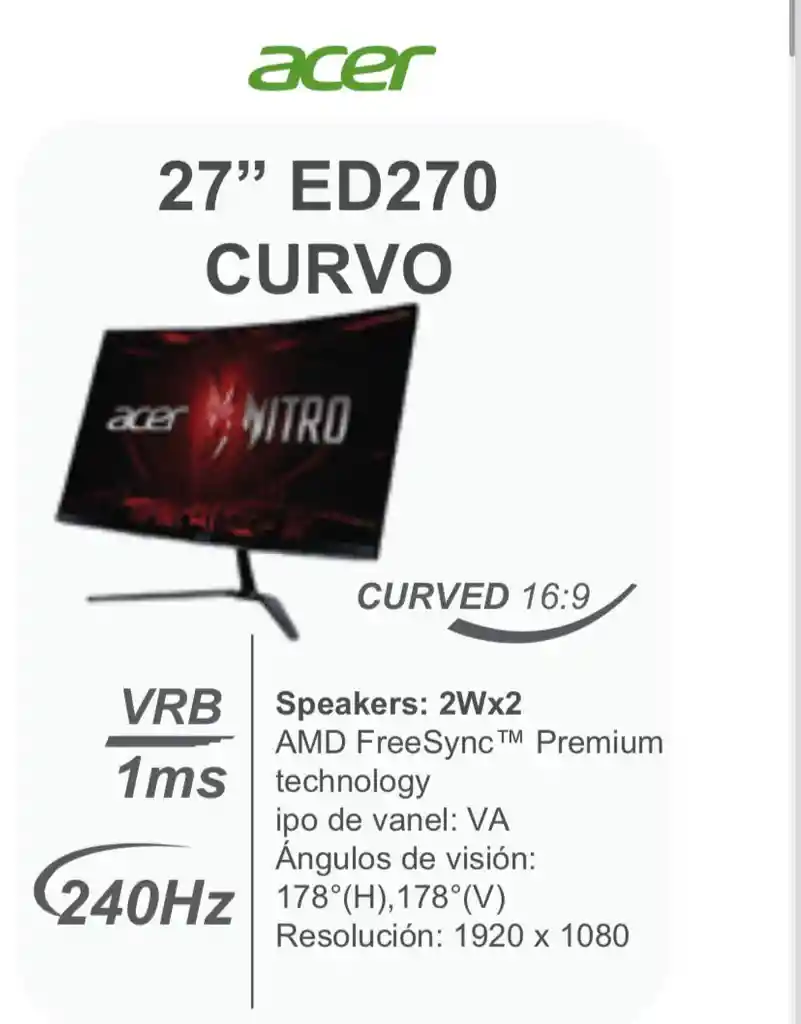 Speakers: 2Wx2 AMD FreeSync™ Premium technology ipo de vanel: VA Ángulos de visión: 178°(H),178°(V) Resolución: 1920 x 1080 EXPOTECNOLOGIA 3505945136