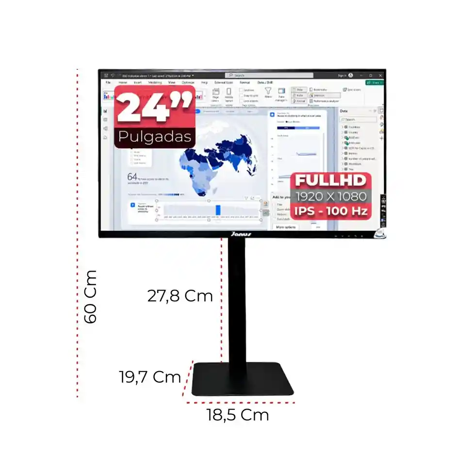 MONITOR DE 24" marca Janus Conectividad: 1 VGA, 1 HDMI, 1 Audio In + speaker Tipo de panel: IPS plano Brillo: 250md/s² Contraste: 1000:1 Profundidad de color: 16.7M Consumo de energía: ≤20w Freesync/G-Sync Resolución: 1920x1080p Relación De Aspecto: Pantalla ancha 16: 9 Tasa de refresco: 100Hz Potencia Parlantes: 3W X 2 Montaje VESA 75*75mm La caja contiene: Cable DP, adaptador, base de desmontaje rápido, manual del usuario EXPOTECNOLOGIA 3505945136