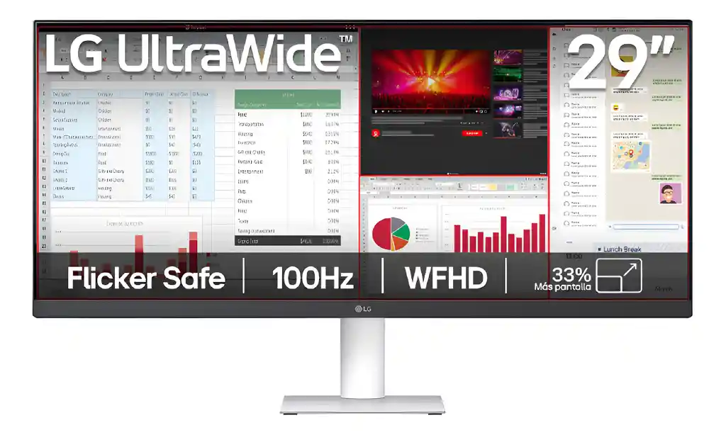 America Store te trae Monitor LG 29 Pulgadas 29u531a Ultrawide Wfhd Plano Blanco Características destacadas Pantalla IPS de 29” WFHD que te da un 33% más de imagen Diseño sin bordes en 3 lados para una vista limpia y sin distracciones HDR10 y puerto USB-C para conectar tu PC Windows o Mac Frecuencia de 100Hz, movimientos más fluidos y sin interrupciones Funciones gamer como Crosshair, DAS y Black Stabilizer para mejor puntería Resumen del producto Solo necesitas un poco más de espacio para que todo fluya mejor. Con su vista panorámica en formato 21:9 que te ofrece un 33% mas de imagen, diseño sin bordes y funciones gamer que responden en milisegundos, el Monitor LG UltraWide de 29” 29U531A-W te permite concentrarte, disfrutar y rendir más sin distracciones. Ideal para quienes trabajan, estudian o juegan desde casa, y buscan una experiencia multitarea, más fluida, envolvente y productiva en un solo equipo que se adapta a su estilo de trabajo o juego. ¡Compra el tuyo ahora !