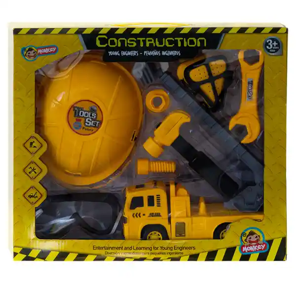 Set Monkey Contiene 7 Unidades. Carro Constructor 1 Und + Martillo 1 Und + Gafas de Seguridad 1 Und + Tuercas 1 Und + Tornillos 1 Und + Herramientas 2 Und. Set de Construcción Con Casco y Varias Herramientas Para Jugar a 'Ser Constructor''. El Juego de Rol Ayuda al Niño a Entender el Mundo Que lo Rodea Fortalece y Estimula el Lenguaje y Fomenta la Creatividad.