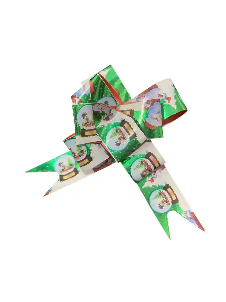 Moño Liston Metalizado Mini Verde Con Diseño De Navidad X Unidad