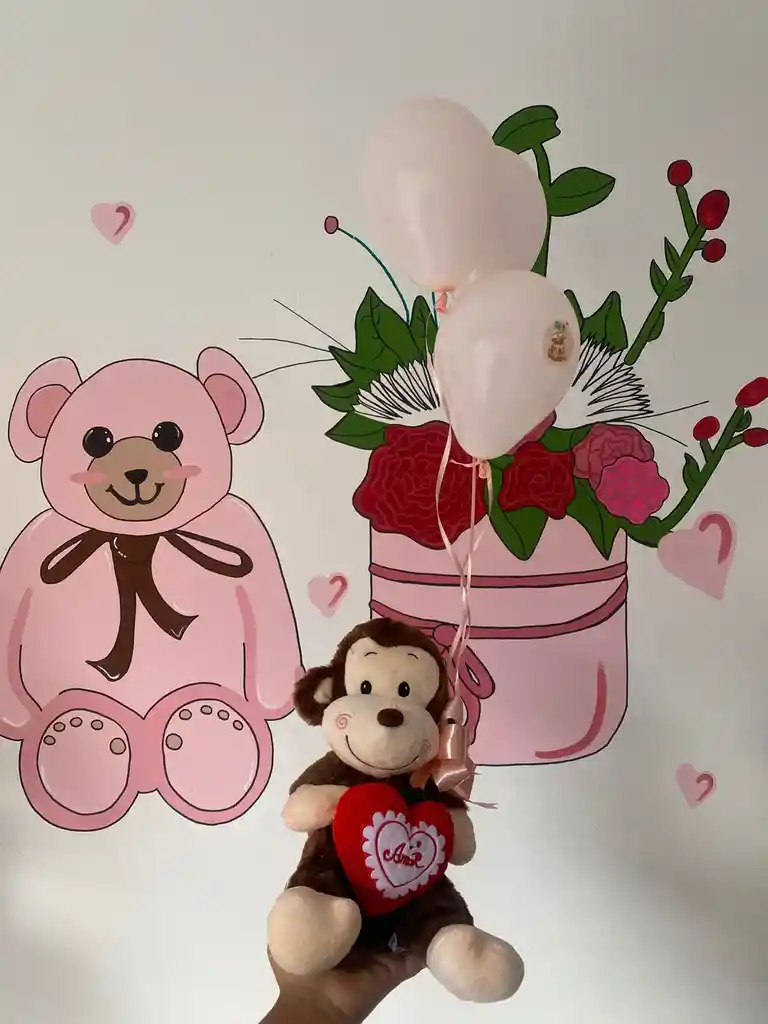 Incluye : peluche en forma de mono de aproximadamente 30cm con corazón en las manos, decorado con globos rosados con helio y moño más mensaje personalizado