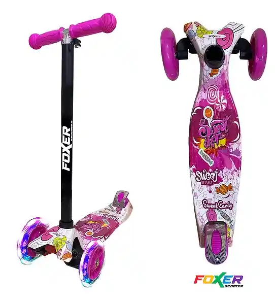 MONOPATI SCOOTER FOXER –ORIGINAL MODELO MAXI CARACTERISTICAS PRINCIPALES: GRADUABLE : Medidas posibles : 65 cm ,68 cm, 80 cm, 86 cm (la unica en el mercado con 4 tamaños diferentes) EDAD : Adecuado para niños de 3 a 12 años MATERIAL : o Manubrio desarmable en aluminio con manijas en goma o Llantas en goma 4 llantas o Base en Fibra de vidrio y Nylon o Freno metalico en la parte trasera para evitar accidentes CAPACIDAD : resiste hasta 58 kilos ENSAMBLE : boton de seguridad en encaje de manurio para evitar que el tubo se salga Las unicas en el mercado con certificacion europea OTRAS CARACTERISTICAS : Dirección asistida con el movimiento del cuerpo (el manubrio no gira si no se da dirección con el pie de los niños para mayor seguridad)