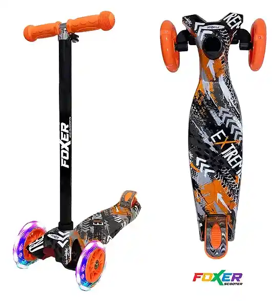 MONOPATI SCOOTER FOXER –ORIGINAL MODELO MAXI CARACTERISTICAS PRINCIPALES: GRADUABLE : Medidas posibles : 65 cm ,68 cm, 80 cm, 86 cm (la unica en el mercado con 4 tamaños diferentes) EDAD : Adecuado para niños de 3 a 12 años MATERIAL : o Manubrio desarmable en aluminio con manijas en goma o Llantas en goma 4 llantas o Base en Fibra de vidrio y Nylon o Freno metalico en la parte trasera para evitar accidentes CAPACIDAD : resiste hasta 58 kilos ENSAMBLE : boton de seguridad en encaje de manurio para evitar que el tubo se salga Las unicas en el mercado con certificacion europea OTRAS CARACTERISTICAS : Dirección asistida con el movimiento del cuerpo (el manubrio no gira si no se da dirección con el pie de los niños para mayor seguridad)