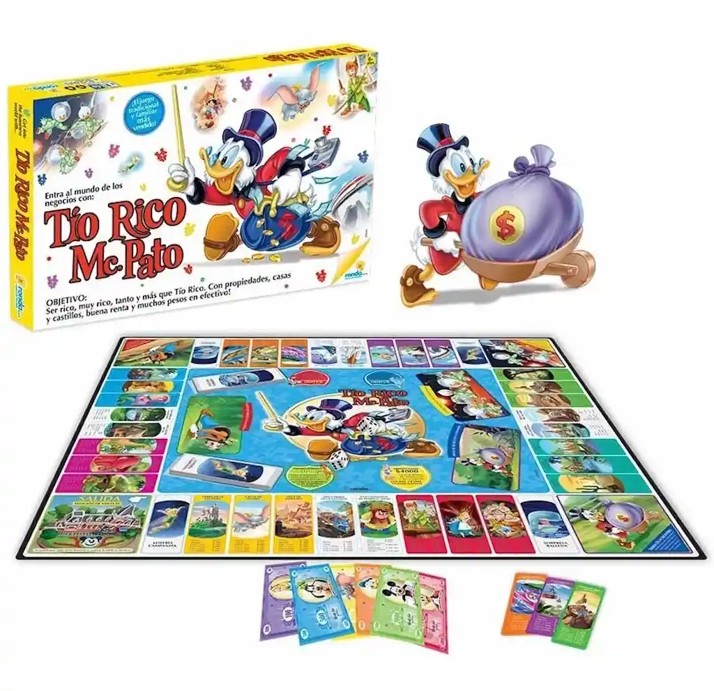 Ser rico, muy rico, tanto y más que tío Rico… Con propiedades, casas y castillos, buena renta y muchos pesos en efectivo. MEDIDAS CAJA: 51,1 x 25,1 x 3,3 cm MEDIDAS TABLERO: 47,8 x 47,8 cm CONTENIDO: 1 Tablero 4 Fichas de Juego 30 Fichas Casas en Pasta 10 Fichas Castillos en Pasta 32 Títulos de Propiedad 22 Cartas “Loteria” y “Sorpresa” 200 Billetes en 6 Denominaciones 2 Dados