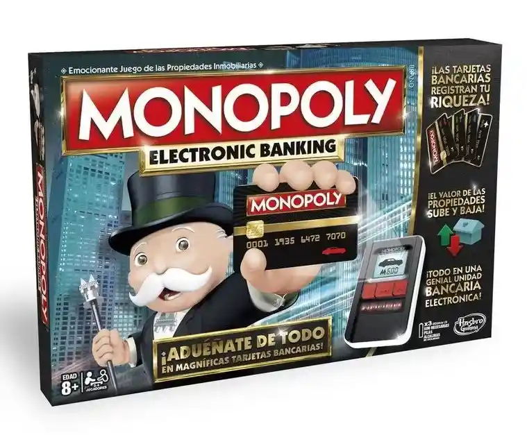 Monopoly banco electrónico primera edición ¿Te imaginas PAGAR en el MONOPOLY con una TARJETA DE CRÉDITO? En Monopoly Banco Electrónico se paga con tarjeta, sí, has leído bien. Cada jugador tiene una tarjeta de crédito para pagar y comprar, con lo que SE ACABARON LAS TRAMPAS de una vez por todas.