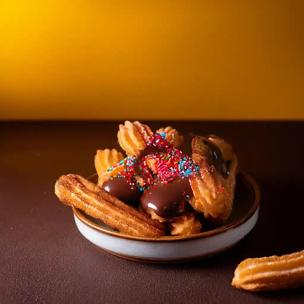 Tres deliciosos churros bañados en tres salsas y tres toppings, una explosión de sabores en cada bocado.