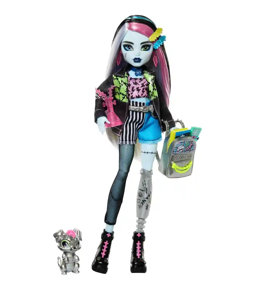 Frankie Stein es un espeluznante ícono de la moda con su electrizante look. Watzie, su perrito, también está listo para unirse a la temible diversión. La muñeca Frankie es un regalo perfecto para niñas y niños de 4 años en adelante, gracias a que está totalmente articulada y a sus increíbles accesorios. La muñeca no se puede mantener de pie por sí sola. Los colores y las decoraciones pueden variar. FRANKIE DE MONSTER HIGH. La espeluznante muñeca Frankie está lista para electrificar el mundo de la moda con un atuendo de alto voltaje y fabulosos accesorios. Viene acompañada de su adorable y terrorífico cachorro Watzie, que tiene destellos metálicos MONSTRUOSOS LOOKS. El set Nuevo Look incluye prendas de moda para crear fabulosos atuendos. Frankie Stein luce una chamarra de mezclilla, shorts con costuras y parches, aretes grandes en forma de rayo y unas botas de combate negras INCLUYE TENEBROSOS ACCESORIOS. Los accesorios ayudarán a crear todo tipo de historias. El set incluye una mochila plateada, cuaderno de ciencias locas, matraz de química, calculadora relámpago, lentes de sol, un almuerzo para llevar y un jugo deslumbrante ESPELUZNANTES AVENTURAS. Completa tu colección de muñecas y sets de juego de Monster High con Frankie Stein y Watzie, su mascota canina. Están diseñadas para inspirar aventuras terroríficas llenas de diversión. Cada muñeca se vende por separado BIENVENIDOS AL MUNDO MONSTER HIGH. Pasillos llenos de hombres lobo, vampiros, criaturas marinas y más: ¡en Monster High, todos pertenecen! Este grupo de amigos, lleno de gritos aterradores y geniales, anima a los niños a celebrar lo que los hace únicos