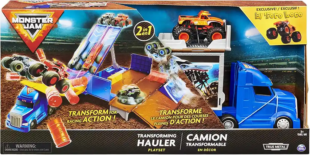 Este camión multifunción, con capacidad para 5 vehículos es para completar tu colección de Monster Jam Ábrelo y despliega dos pistas para doble diversión. La doble rampa con salto para competir con tus rivales y envestir los barriles, y la pista tradicional con un salto para realizar piruetas y el “Donut Spinner”, para hacer girar tu vehículo con velocidad Convierte tu camión en las pistas Monster Jam y luego transfórmalo otra vez en camión para llevarlo donde quieras. Con capacidad para transportar 5 Monster Jam. Producto de alta calidad y diversión garantizada. Creado con tecnología de última generación. Diseñado para todos los niños.