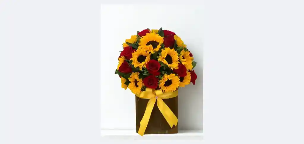 Caja de 15 girasoles y 20 rosas Nota: La flor puede ser sustituida dependiendo la disponibilidad de color y del producto “Mensaje Personalizado” máximo de 30 caracteres (Dejar el mensaje en el chat, los comentarios no se previsualizan para la tienda por lo que si se dejan allí no podrá ser incluido).