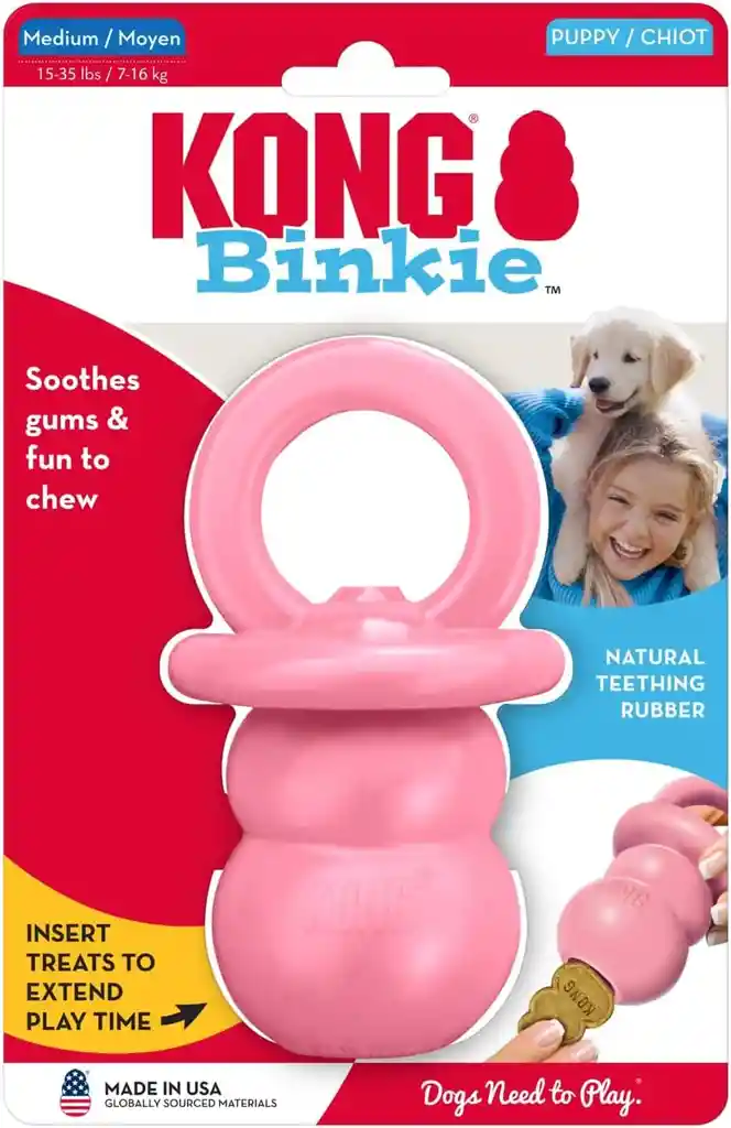 Juguete para cachorros con diseño de chupete: Este juguete pequeño para perros está elaborado con una forma distintiva de chupete utilizando una fórmula de goma natural suave diseñada para calmar a los cachorros durante la dentición Juguete multifuncional Binkie: este juguete para cachorros alivia la masticación, la dentición y el aburrimiento, al tiempo que promueve la independencia y las habilidades de resolución de problemas Capacidades de relleno de golosinas: el interior hueco permite rellenarlo